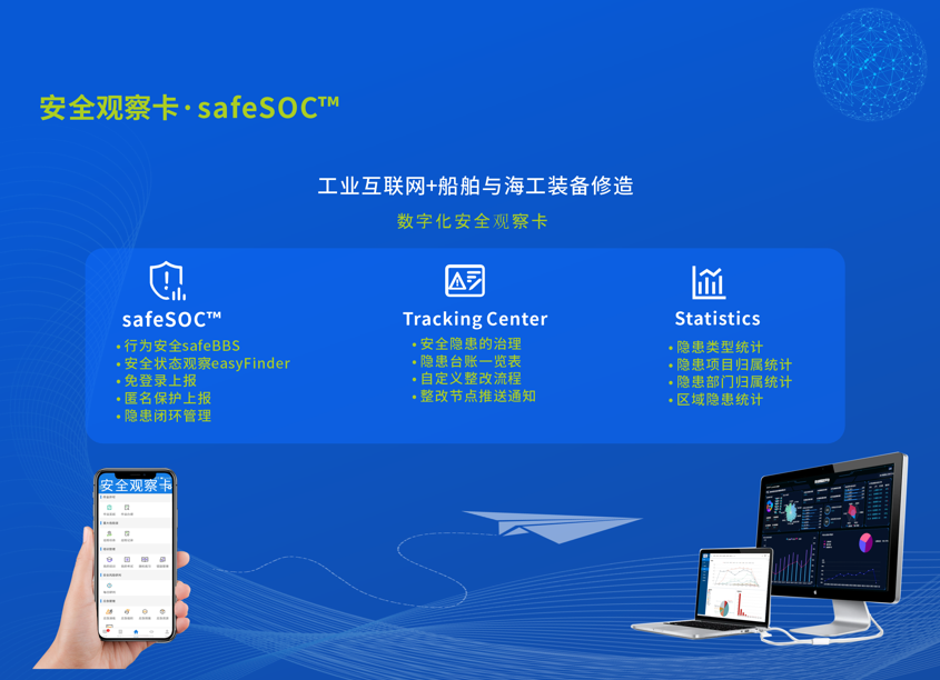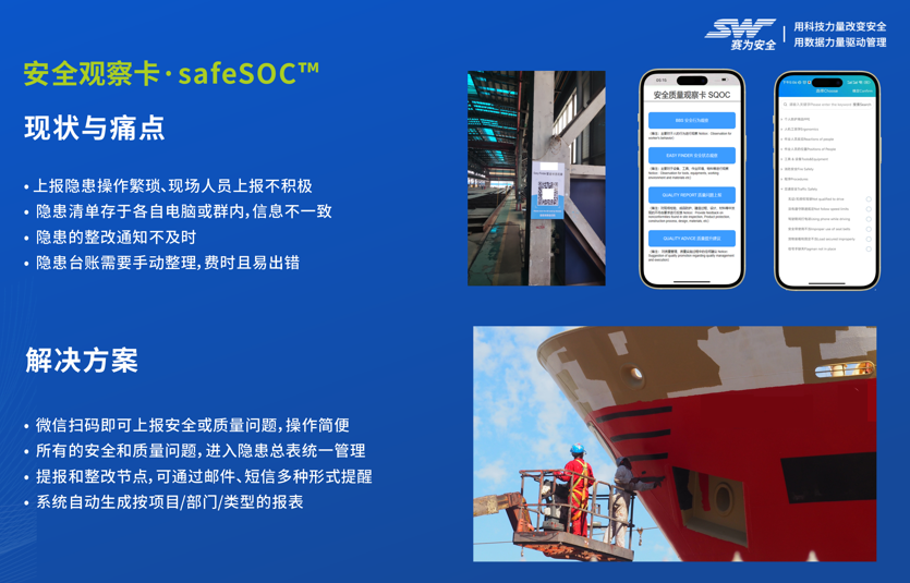 賽為安全公司獨(dú)立自主開(kāi)發(fā)的“賽安·安全觀察卡 safeSOC”,可以進(jìn)行人員行為安全觀察、設(shè)備、物料和環(huán)境的安全狀態(tài)觀察,極簡(jiǎn)易的操作方式,業(yè)主、本工、承包商通過(guò)手機(jī)掃碼,可以在數(shù)秒內(nèi)上報(bào)隱患,可后續(xù)進(jìn)行閉環(huán)跟進(jìn)管理,降低或杜絕船艙等受限空間事故的發(fā)生。